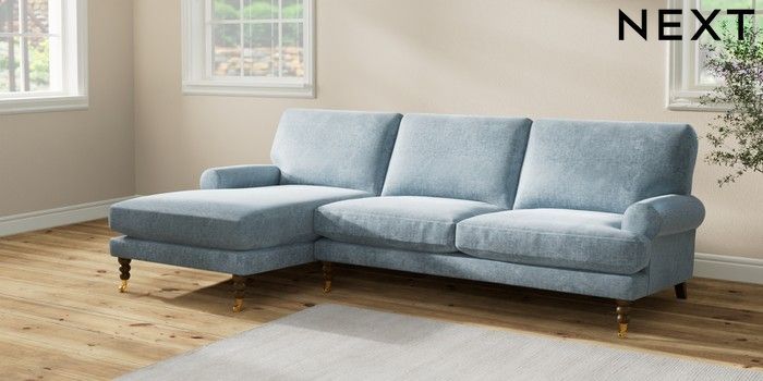 7.2.10 Erin Deep Relaxed Sit Medium Sofa Chaise - Left Hand Plush Chenille Light Blue High Classic Turned Brass Castor - Mid | Made Click here to use our website with more accessibility support, for example screen readers