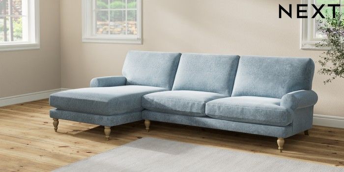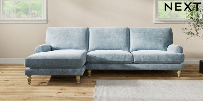 7.2.10 Erin Deep Relaxed Sit Medium Sofa Chaise - Left Hand Plush Chenille Light Blue High Classic Turned - Light | Made Click here to use our website with more accessibility support, for example screen readers