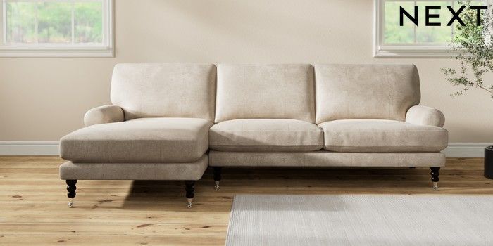 7.2.10 Erin Deep Relaxed Sit Medium Sofa Chaise - Left Hand Plush Chenille Light Natural High Classic Turned Chrome Castor - Dark | Made Click here to use our website with more accessibility support, for example screen readers