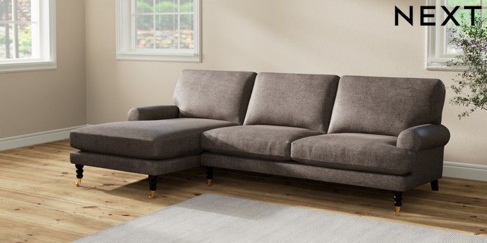 7.2.10 Erin Deep Relaxed Sit Medium Sofa Chaise - Left Hand Plush Chenille Mink Brown High Classic Turned Brass Castor - Dark | Made Click here to use our website with more accessibility support, for example screen readers