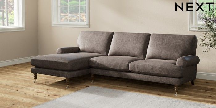 7.2.10 Erin Deep Relaxed Sit Medium Sofa Chaise - Left Hand Plush Chenille Mink Brown High Classic Turned Chrome Castor - Mid | Made Click here to use our website with more accessibility support, for example screen readers