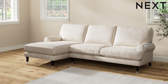 7.2.10 Erin Deep Relaxed Sit Medium Sofa Chaise - Left Hand Plush Chenille Oyster High Classic Turned Chrome Castor - Dark | Made Click here to use our website with more accessibility support, for example screen readers