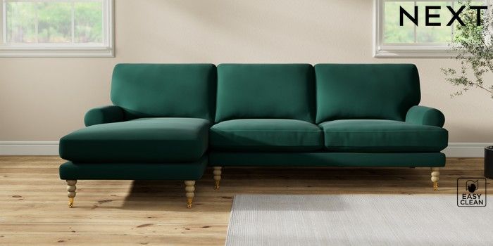 7.2.10 Erin Deep Relaxed Sit Medium Sofa Chaise - Left Hand Plush Velvet Easy Clean Bottle Green High Classic Turned Brass Castor - Light | Made Click here to use our website with more accessibility support, for example screen readers