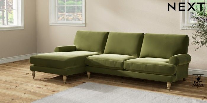 7.2.10 Erin Deep Relaxed Sit Medium Sofa Chaise - Left Hand Plush Velvet Easy Clean Mid Olive Green High Classic Turned - Light | Made Click here to use our website with more accessibility support, for example screen readers
