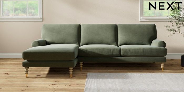 7.2.10 Erin Deep Relaxed Sit Medium Sofa Chaise - Left Hand Relaxed Linen Look Dark Green High Classic Turned Brass Castor - Light | Made Click here to use our website with more accessibility support, for example screen readers