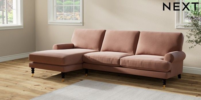 7.2.10 Erin Deep Relaxed Sit Medium Sofa Chaise - Left Hand Relaxed Linen Look Light Rust Brown High Classic Turned Brass Castor - Dark | Made Click here to use our website with more accessibility support, for example screen readers
