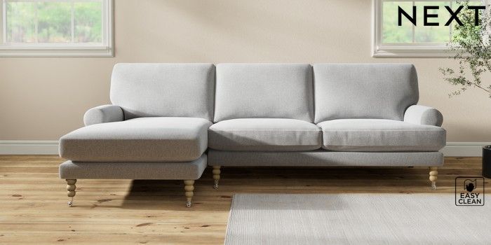 7.2.10 Erin Deep Relaxed Sit Medium Sofa Chaise - Left Hand Tweedy Blend Easy Clean Light Silver Grey High Classic Turned Chrome Castor - Light | Made Click here to use our website with more accessibility support, for example screen readers
