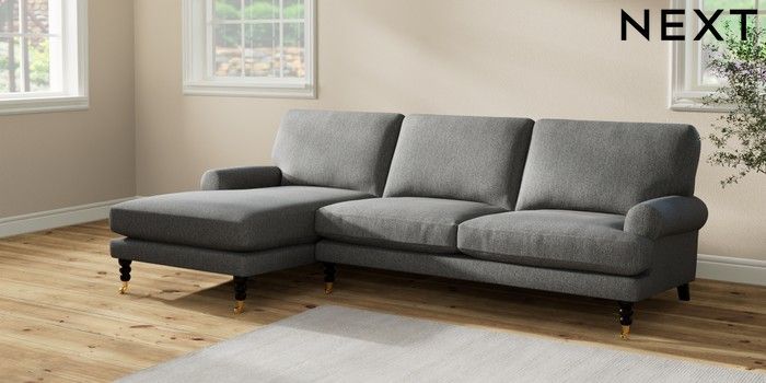 7.2.10 Erin Deep Relaxed Sit Medium Sofa Chaise - Left Hand Tweedy Chenille Dark Grey High Classic Turned Brass Castor - Dark | Made Click here to use our website with more accessibility support, for example screen readers