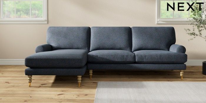 7.2.10 Erin Deep Relaxed Sit Medium Sofa Chaise - Left Hand Tweedy Chenille Navy Blue High Classic Turned Brass Castor - Light | Made Click here to use our website with more accessibility support, for example screen readers