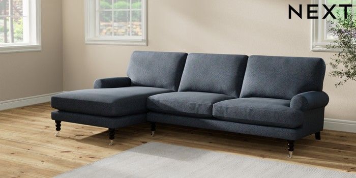 7.2.10 Erin Deep Relaxed Sit Medium Sofa Chaise - Left Hand Tweedy Chenille Navy Blue High Classic Turned Chrome Castor - Dark | Made Click here to use our website with more accessibility support, for example screen readers