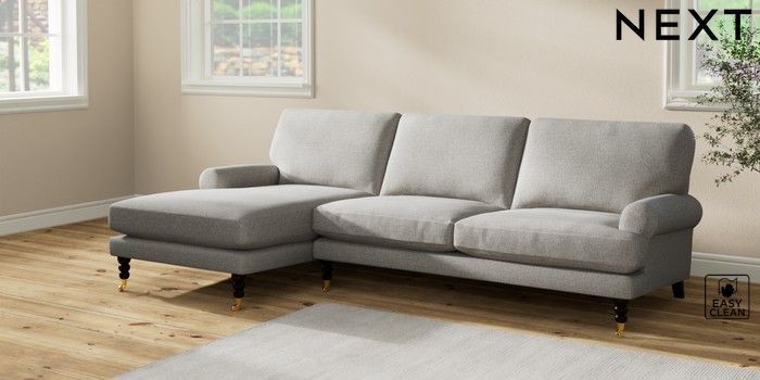 7.2.10 Erin Deep Relaxed Sit Medium Sofa Chaise - Left Hand Woven Chenille Easy Clean Light Grey High Classic Turned Brass Castor - Dark | Made Click here to use our website with more accessibility support, for example screen readers