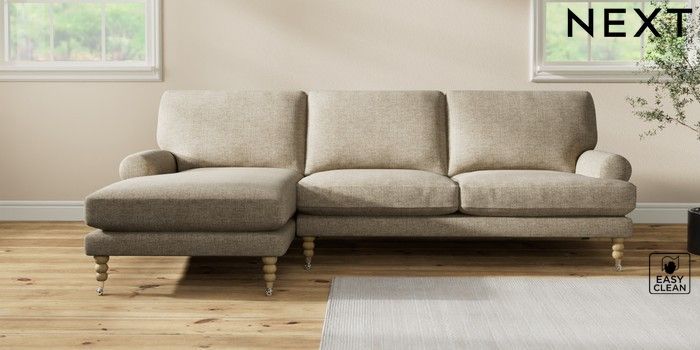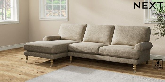 7.2.10 Erin Deep Relaxed Sit Medium Sofa Chaise - Left Hand Woven Chenille Easy Clean Mid Natural High Classic Turned Chrome Castor - Light | Made Click here to use our website with more accessibility support, for example screen readers