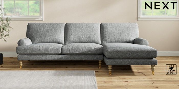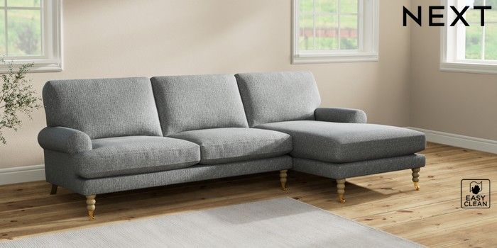 7.2.10 Erin Deep Relaxed Sit Medium Sofa Chaise - Right Hand Chunky Boucle Easy Clean Mid Grey High Classic Turned Brass Castor - Light | Made Click here to use our website with more accessibility support, for example screen readers