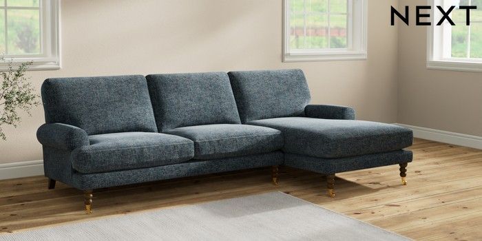 7.2.10 Erin Deep Relaxed Sit Medium Sofa Chaise - Right Hand Chunky Chenille Dark Navy Blue High Classic Turned Brass Castor - Mid | Made Click here to use our website with more accessibility support, for example screen readers