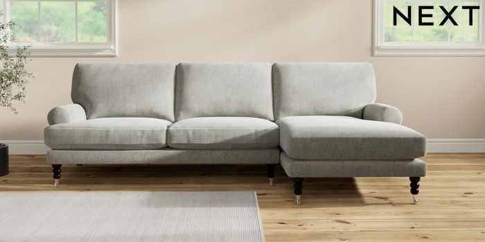 7.2.10 Erin Deep Relaxed Sit Medium Sofa Chaise - Right Hand Chunky Chenille Light Grey High Classic Turned Chrome Castor - Dark | Made Click here to use our website with more accessibility support, for example screen readers