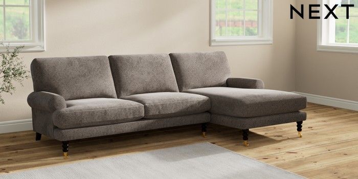 7.2.10 Erin Deep Relaxed Sit Medium Sofa Chaise - Right Hand Chunky Chenille Mink Brown High Classic Turned Brass Castor - Dark | Made Click here to use our website with more accessibility support, for example screen readers