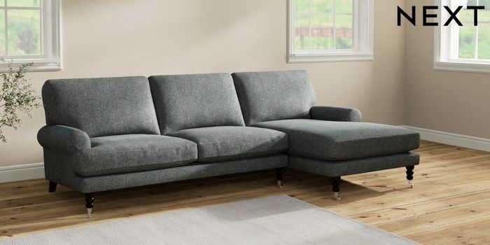 7.2.10 Erin Deep Relaxed Sit Medium Sofa Chaise - Right Hand Cotswold Chenille Dark Grey High Classic Turned Chrome Castor - Dark | Made Click here to use our website with more accessibility support, for example screen readers