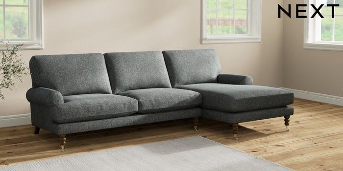7.2.10 Erin Deep Relaxed Sit Medium Sofa Chaise - Right Hand Cotswold Chenille Dark Grey High Classic Turned Chrome Castor - Mid | Made Click here to use our website with more accessibility support, for example screen readers