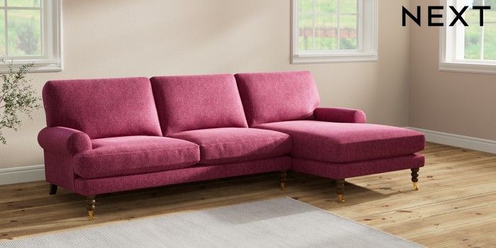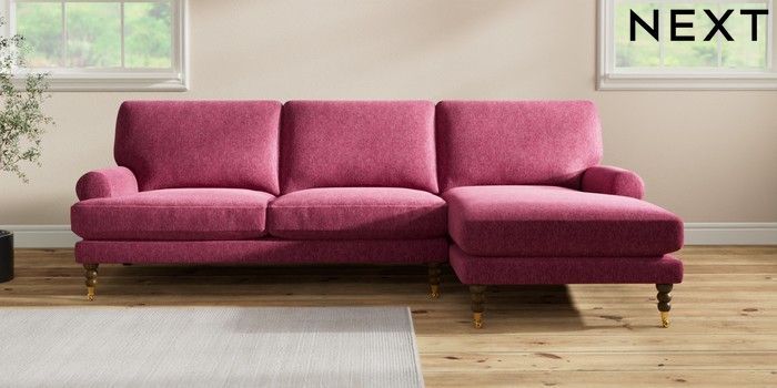 7.2.10 Erin Deep Relaxed Sit Medium Sofa Chaise - Right Hand Cotswold Chenille Dark Raspberry Pink High Classic Turned Brass Castor - Mid | Made Click here to use our website with more accessibility support, for example screen readers