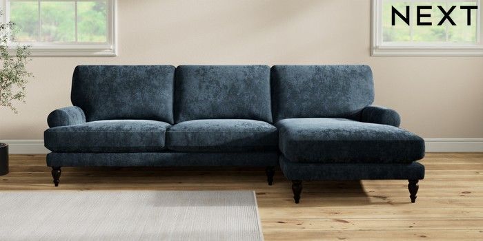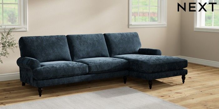 7.2.10 Erin Deep Relaxed Sit Medium Sofa Chaise - Right Hand Distressed Velour Midnight Blue High Classic Turned - Dark | Made Click here to use our website with more accessibility support, for example screen readers