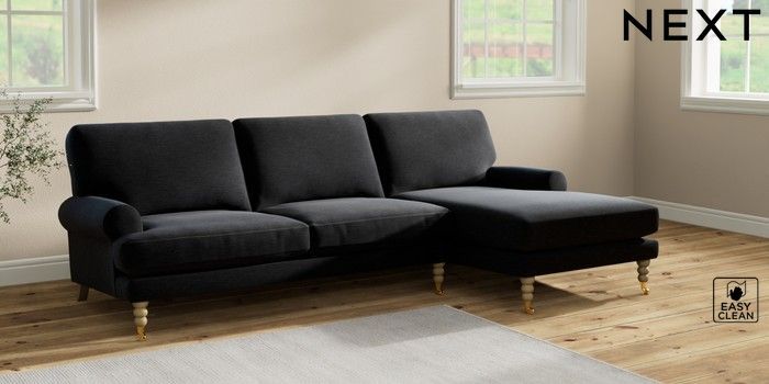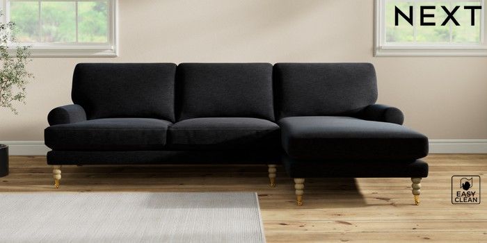 7.2.10 Erin Deep Relaxed Sit Medium Sofa Chaise - Right Hand Fine Chenille Easy Clean Black High Classic Turned Brass Castor - Light | Made Click here to use our website with more accessibility support, for example screen readers