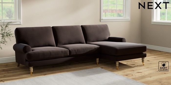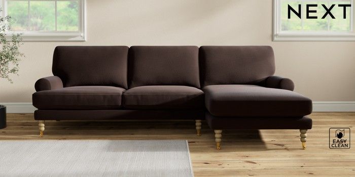 7.2.10 Erin Deep Relaxed Sit Medium Sofa Chaise - Right Hand Fine Chenille Easy Clean Chocolate Brown High Classic Turned Brass Castor - Light | Made Click here to use our website with more accessibility support, for example screen readers