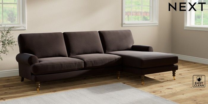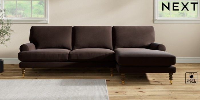 7.2.10 Erin Deep Relaxed Sit Medium Sofa Chaise - Right Hand Fine Chenille Easy Clean Chocolate Brown High Classic Turned Brass Castor - Mid | Made Click here to use our website with more accessibility support, for example screen readers