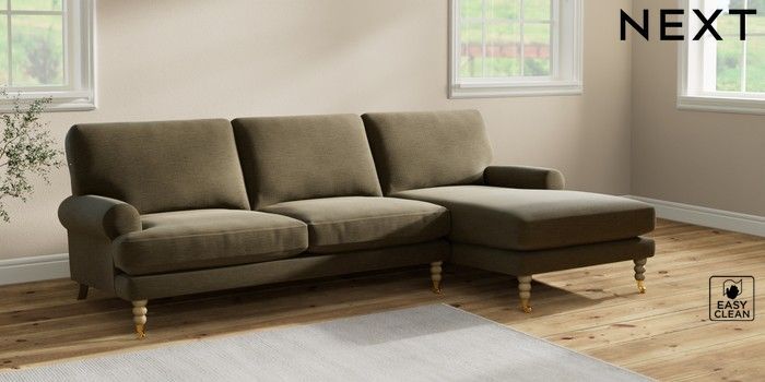 7.2.10 Erin Deep Relaxed Sit Medium Sofa Chaise - Right Hand Fine Chenille Easy Clean Dark Moss Green High Classic Turned Brass Castor - Light | Made Click here to use our website with more accessibility support, for example screen readers