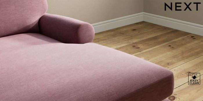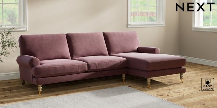 7.2.10 Erin Deep Relaxed Sit Medium Sofa Chaise - Right Hand Fine Chenille Easy Clean Mid Mulberry Purple High Classic Turned Brass Castor - Light | Made Click here to use our website with more accessibility support, for example screen readers