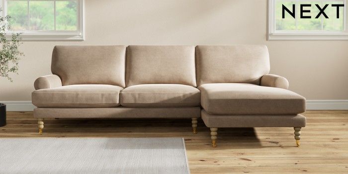 7.2.10 Erin Deep Relaxed Sit Medium Sofa Chaise - Right Hand Luxe Chenille Mid Camel Beige High Classic Turned Brass Castor - Light | Made Click here to use our website with more accessibility support, for example screen readers