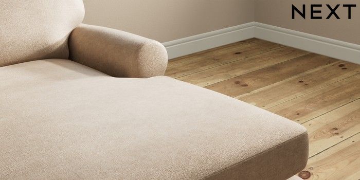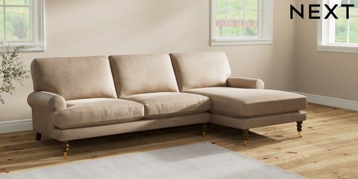 7.2.10 Erin Deep Relaxed Sit Medium Sofa Chaise - Right Hand Luxe Chenille Mid Camel Beige High Classic Turned Brass Castor - Mid | Made Click here to use our website with more accessibility support, for example screen readers