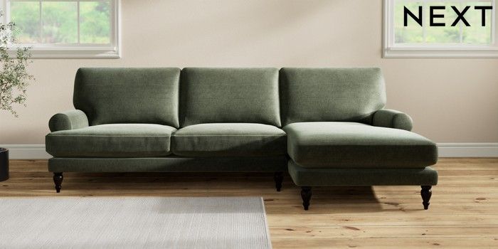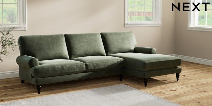 7.2.10 Erin Deep Relaxed Sit Medium Sofa Chaise - Right Hand Luxe Chenille Mid Green High Classic Turned - Dark | Made Click here to use our website with more accessibility support, for example screen readers