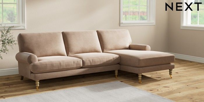 7.2.10 Erin Deep Relaxed Sit Medium Sofa Chaise - Right Hand Luxe Chenille Mid Natural High Classic Turned Brass Castor - Light | Made Click here to use our website with more accessibility support, for example screen readers