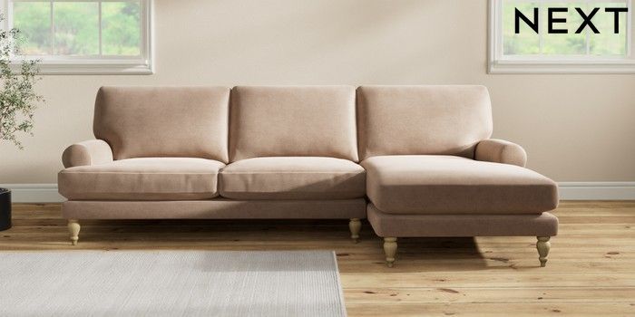 7.2.10 Erin Deep Relaxed Sit Medium Sofa Chaise - Right Hand Luxe Chenille Mid Natural High Classic Turned - Light | Made Click here to use our website with more accessibility support, for example screen readers