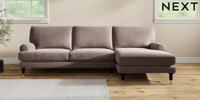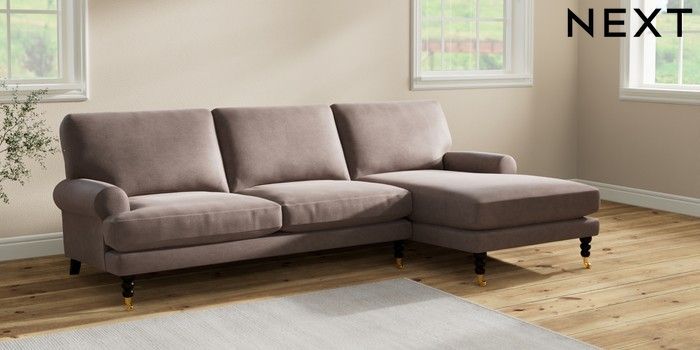 7.2.10 Erin Deep Relaxed Sit Medium Sofa Chaise - Right Hand Luxe Chenille Mink Brown High Classic Turned Brass Castor - Dark | Made Click here to use our website with more accessibility support, for example screen readers
