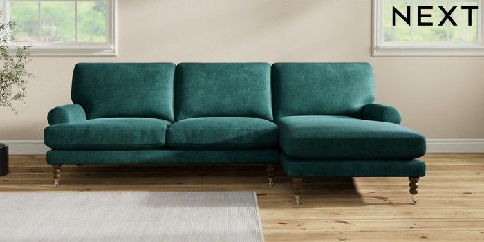 7.2.10 Erin Deep Relaxed Sit Medium Sofa Chaise - Right Hand Plush Chenille Dark Teal Green High Classic Turned Chrome Castor - Mid | Made Click here to use our website with more accessibility support, for example screen readers