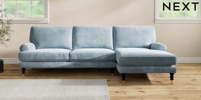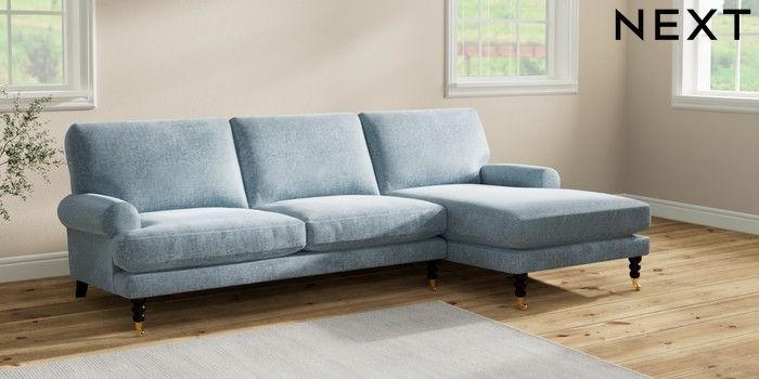 7.2.10 Erin Deep Relaxed Sit Medium Sofa Chaise - Right Hand Plush Chenille Light Blue High Classic Turned Brass Castor - Dark | Made Click here to use our website with more accessibility support, for example screen readers