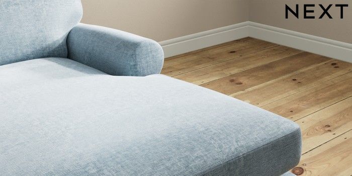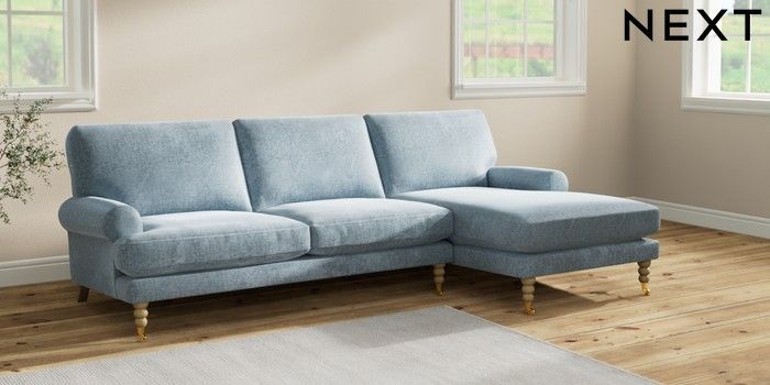 7.2.10 Erin Deep Relaxed Sit Medium Sofa Chaise - Right Hand Plush Chenille Light Blue High Classic Turned Brass Castor - Light | Made Click here to use our website with more accessibility support, for example screen readers
