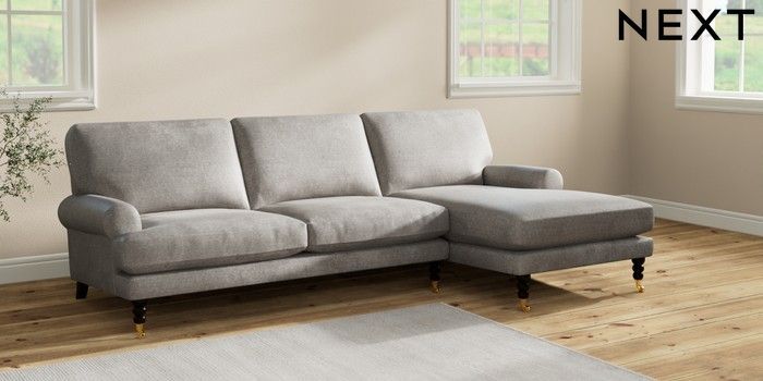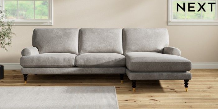 7.2.10 Erin Deep Relaxed Sit Medium Sofa Chaise - Right Hand Plush Chenille Light Grey High Classic Turned Brass Castor - Dark | Made Click here to use our website with more accessibility support, for example screen readers