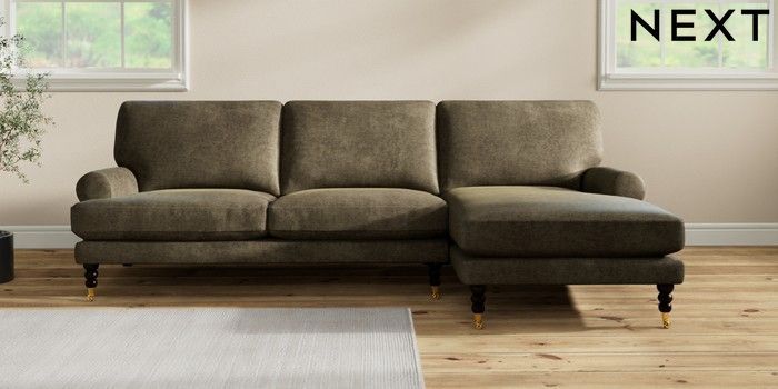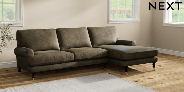 7.2.10 Erin Deep Relaxed Sit Medium Sofa Chaise - Right Hand Plush Chenille Moss Green High Classic Turned Brass Castor - Dark | Made Click here to use our website with more accessibility support, for example screen readers