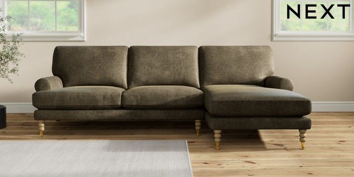 7.2.10 Erin Deep Relaxed Sit Medium Sofa Chaise - Right Hand Plush Chenille Moss Green High Classic Turned Brass Castor - Light | Made Click here to use our website with more accessibility support, for example screen readers