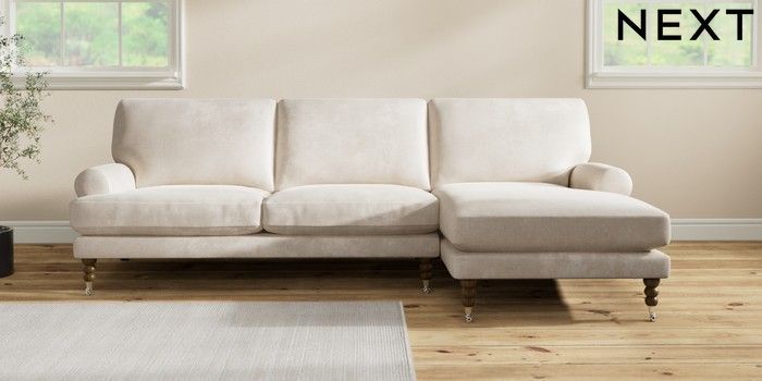 7.2.10 Erin Deep Relaxed Sit Medium Sofa Chaise - Right Hand Plush Chenille Oyster High Classic Turned Chrome Castor - Mid | Made Click here to use our website with more accessibility support, for example screen readers