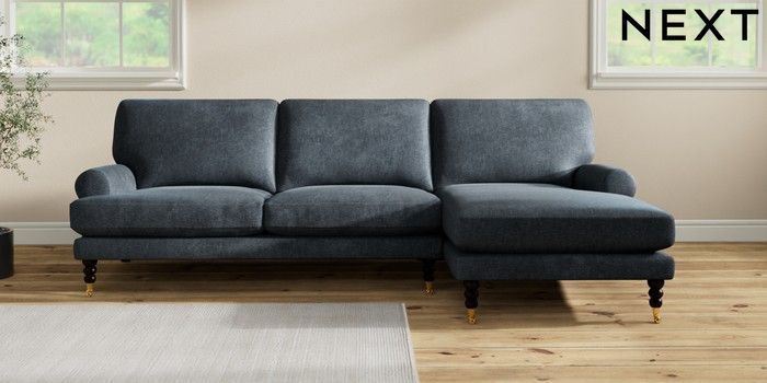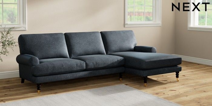 7.2.10 Erin Deep Relaxed Sit Medium Sofa Chaise - Right Hand Plush Chenille Slate Blue High Classic Turned Brass Castor - Dark | Made Click here to use our website with more accessibility support, for example screen readers