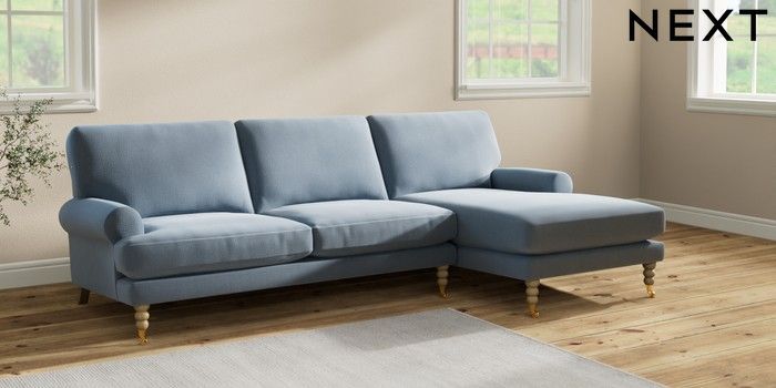 7.2.10 Erin Deep Relaxed Sit Medium Sofa Chaise - Right Hand Relaxed Linen Look Mid Blue High Classic Turned Brass Castor - Light | Made Click here to use our website with more accessibility support, for example screen readers