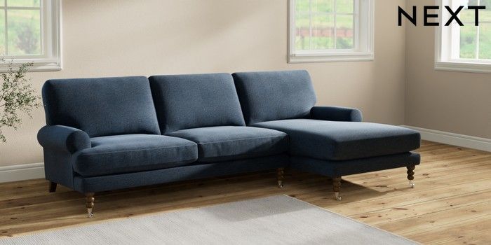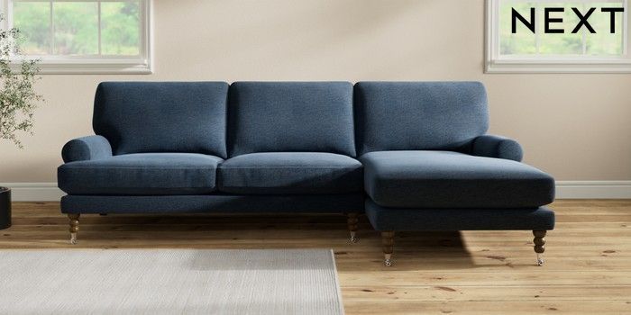 7.2.10 Erin Deep Relaxed Sit Medium Sofa Chaise - Right Hand Ripple Chenille Dark Blue High Classic Turned Chrome Castor - Mid | Made Click here to use our website with more accessibility support, for example screen readers