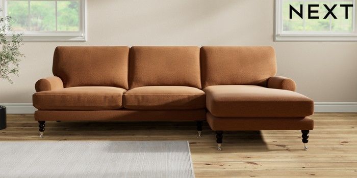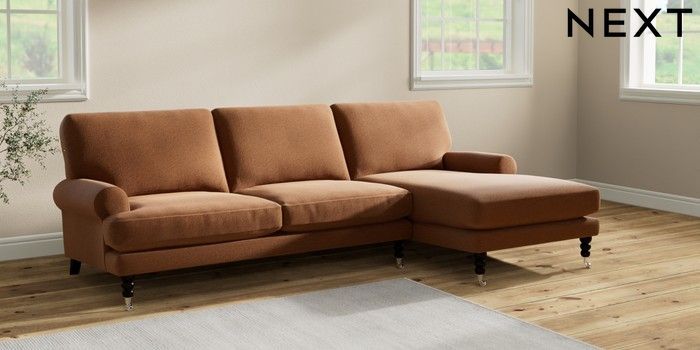 7.2.10 Erin Deep Relaxed Sit Medium Sofa Chaise - Right Hand Ripple Chenille Mid Rust Brown High Classic Turned Chrome Castor - Dark | Made Click here to use our website with more accessibility support, for example screen readers