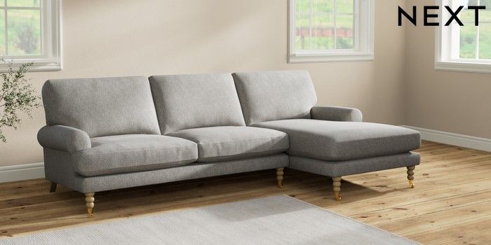 7.2.10 Erin Deep Relaxed Sit Medium Sofa Chaise - Right Hand Tweedy Chenille Mid Grey High Classic Turned Brass Castor - Light | Made Click here to use our website with more accessibility support, for example screen readers