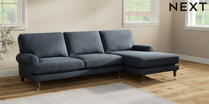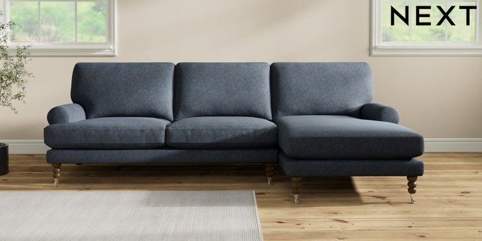 7.2.10 Erin Deep Relaxed Sit Medium Sofa Chaise - Right Hand Tweedy Chenille Navy Blue High Classic Turned Chrome Castor - Mid | Made Click here to use our website with more accessibility support, for example screen readers