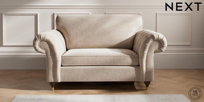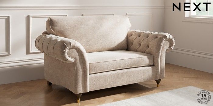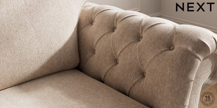 7.2.10 Gosford Highback II Deep Sit 2 Seater Small Sofa Cotswold Chenille Light Natural Modern Turned Metal Cap - Mid | Made Click here to use our website with more accessibility support, for example screen readers