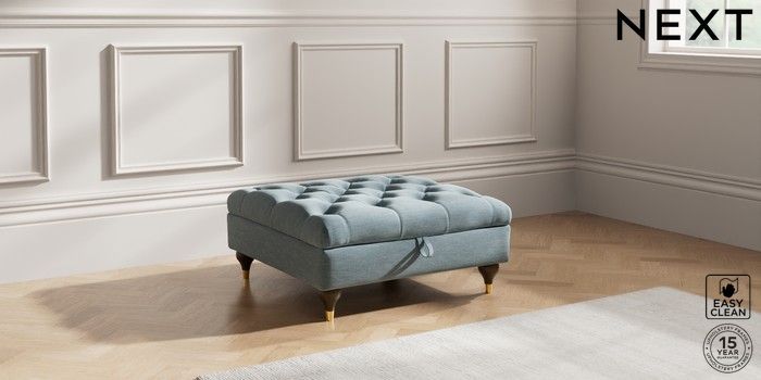 7.2.10 Gosford Highback II Deep Sit Extra Large Storage Footstool Fine Chenille Easy Clean Mid Blue Modern Turned Metal Cap - Mid | Made Click here to use our website with more accessibility support, for example screen readers